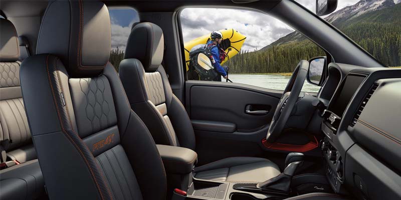There's room for up to five people in the larger Frontier cab. It comes with cloth upholstery, a tilt steering wheel, and push-button start. The SV adds a power-adjustable driver's seat, while the optional SV Convenience Package adds a heated and leather-wrapped steering wheel, heated front seats, and dual-zone automatic climate control. You can get leather upholstery and upgrade interior trim elements with the Pro Premium Package for the Pro-4X. The tech features in the Frontier start with an 8-inch touch-screen to house the infotainment system that works with Apple CarPlay and Android Auto. It also has two USB ports, a 12-volt power outlet, and a 7-inch driver information display. The Pro-4X upgrades to a 9-inch touch-screen, adds a 10-speaker stereo system, navigation, NissanConnect Services, and a Wi-Fi hotspot. Opt for the Pro Convenience Package, and you'll also get a wireless smartphone charging pad.