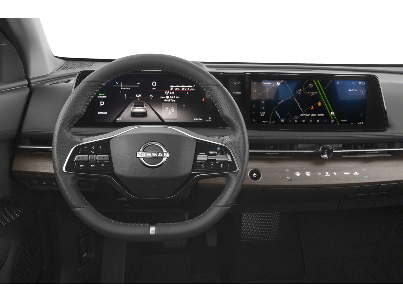 - Radio: AM/FM Audio System -inc: 12.3" color display w/multi-touch control, 6 speakers, MP3/WMA playback, Bluetooth® streaming audio, speed-sensitive volume control (SSV), satellite radio pre-wiring, SiriusXM satellite radio w/advanced features, SiriusXM Traffic, SiriusXM Travel Link, NissanConnect EV featuring wireless Apple CarPlay, wired Android Auto, navigation and NissanConnect services, Bluetooth® hands-free phone system (w/voice recognition in English, French and Spanish), voice destination entry (VDE) and hands-free text messaging assistant